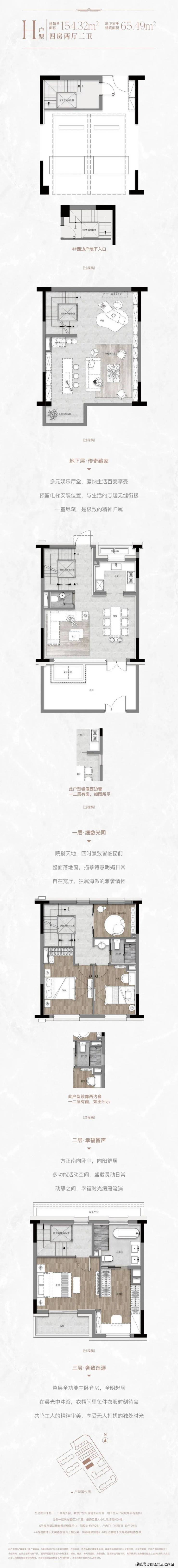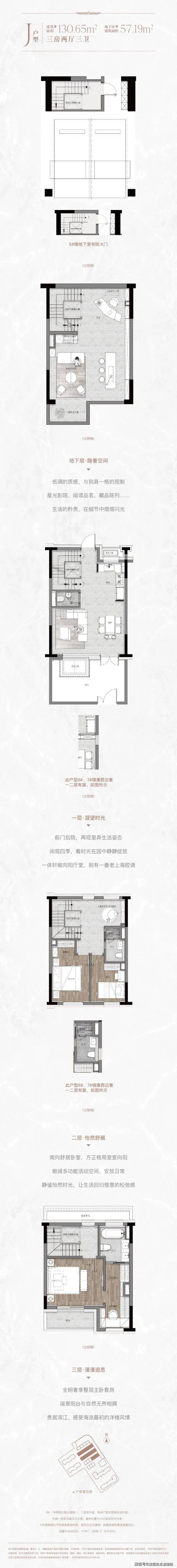 联排别墅:建面约130–154㎡,四层立体空间(地上三层+地下一层),附赠面积达80㎡以上,带花园、露台、地下室