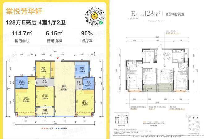(3)建面约128㎡的四房两厅两卫户型,四开间朝南,拥有封闭式阳台,南向采光充足,使得整体空间更加宽敞明亮。