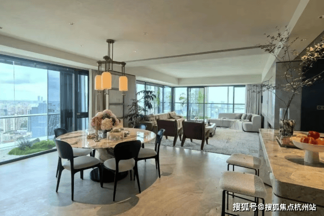 客厅以超大尺度惊艳亮相,若打通北向X空间,可拓展为 约90㎡超级厅堂 ,家族宴请or高端社交,皆能轻松承载;约270°环幕视野将采光与观景效果推向极致, 中高楼层可眺望陆家嘴三件套
