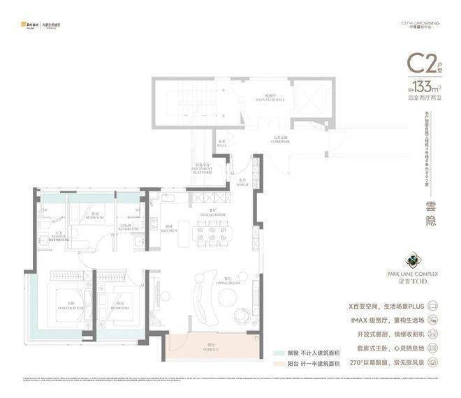 133㎡可以说是108㎡的进阶款,同样的三房两厅两卫,大面宽横厅、半开放式厨房设置岛台,加上主卧L型飘窗,再一次验证了华润置地豪宅化的产品思路。