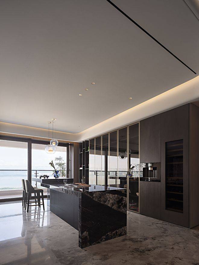 黑色岩板台面与整体色调形成戏剧性对比,赋予空间沉稳的质感。