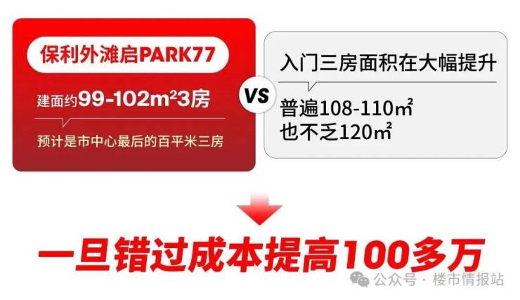 当下市场,入门三房面积正大幅扩容,普遍达到108-110㎡,甚至直接跃升至120㎡。而保利外滩启PARK77 建面约99-102㎡3房,堪称市中心最后一批“百平米三房”,一旦错过,购房成本将直接增加100多万!