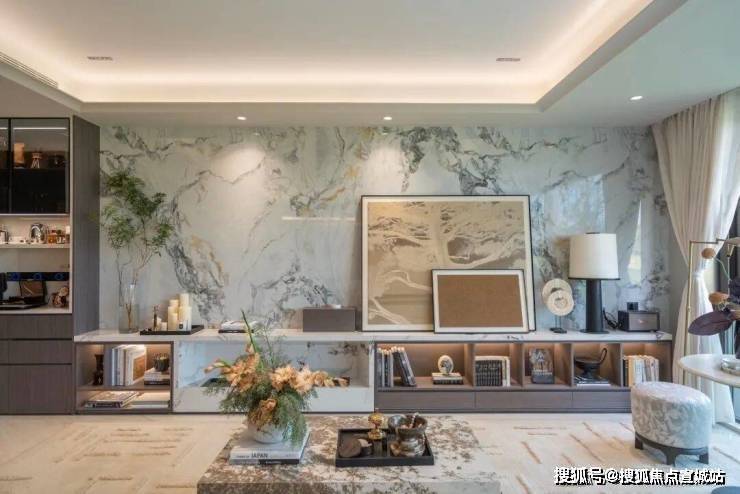 LDKG一体化设计,搭配大面落地玻璃,地面白金沙岩板通铺,吊顶是大通顶,双背景墙采用壁布硬包、帝王翡翠岩板,没有多余的结构墙体,以豪奢尺度构建出家庭交流的超级广域公区。