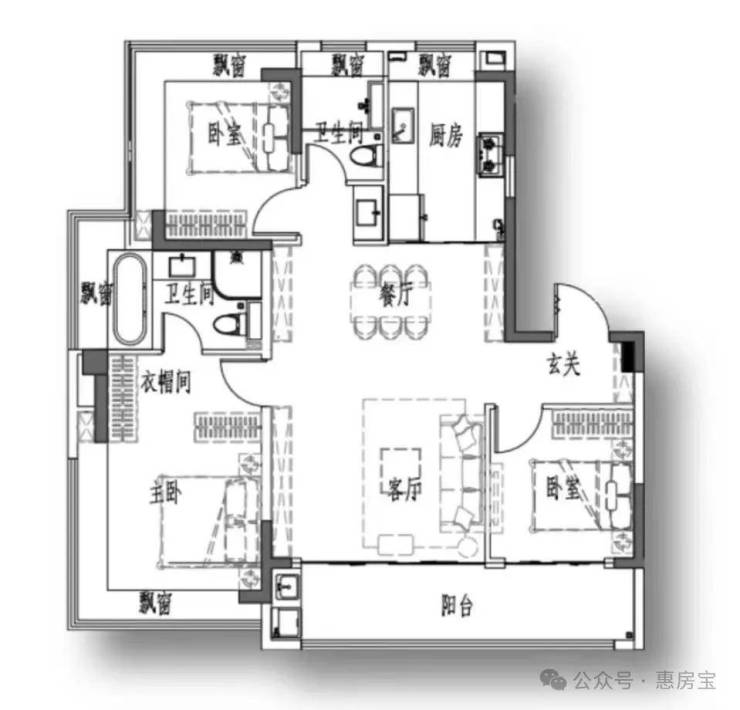 边套户型主卧以及北房间均为270°飘窗,另外主卫也带飘窗!