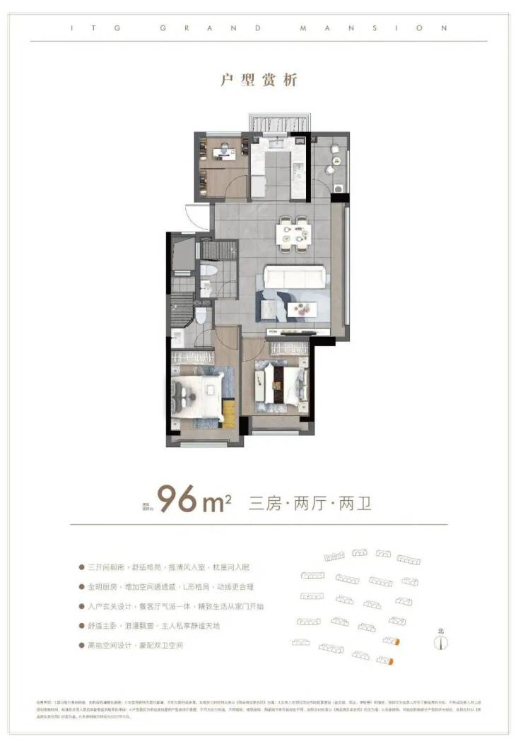 户型方面:约85-96㎡的全三房设计,南北通透,布局考究,动静分离。