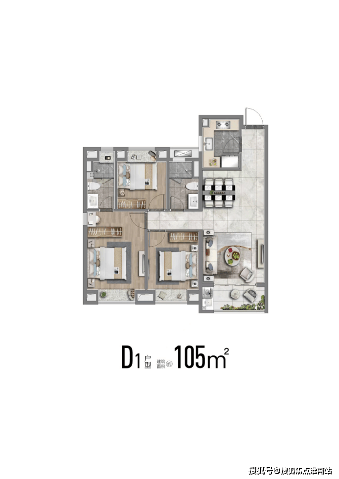 也有建面约113m²舒适性三房,南北通透;飞机户型,房间分列两侧互不打扰;卧室空间也相对更大、更舒适。