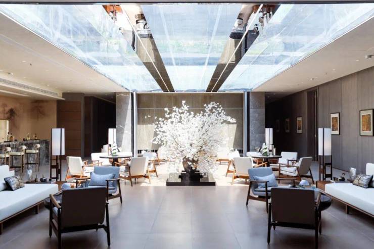 除此之外,叠拼泛大堂区域还使用了铝板及铝格栅吊顶;