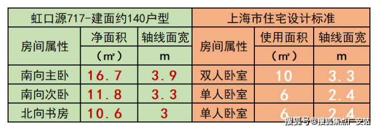 对比最新的《上海市住宅设计标准》,每一个居室的面积都远超标准,北卧室更是超过标准规定值的约76.5%。