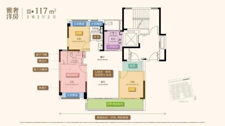 南北通透双联阳台;户型利用率高;主卧约3.5米开间套房、北次卧小套房、南次卧约 3.3 米开间,兼顾舒居与隐私,实现“空间平权”。