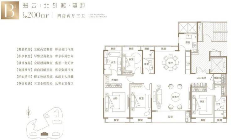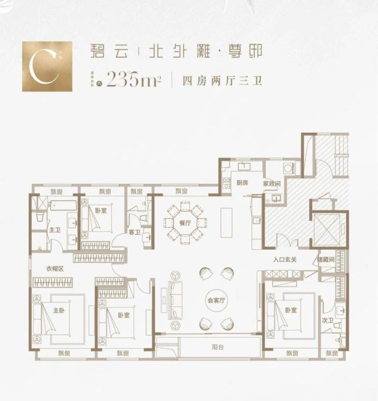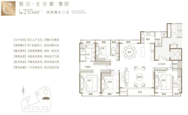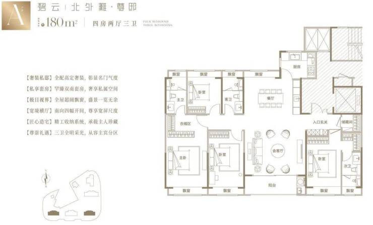 - 全系大平层:180-235㎡四房五房户型,标配劳芬智能卫浴、嘉格纳厨电、旭格系统窗,户户带独立玄关、双套房设计。