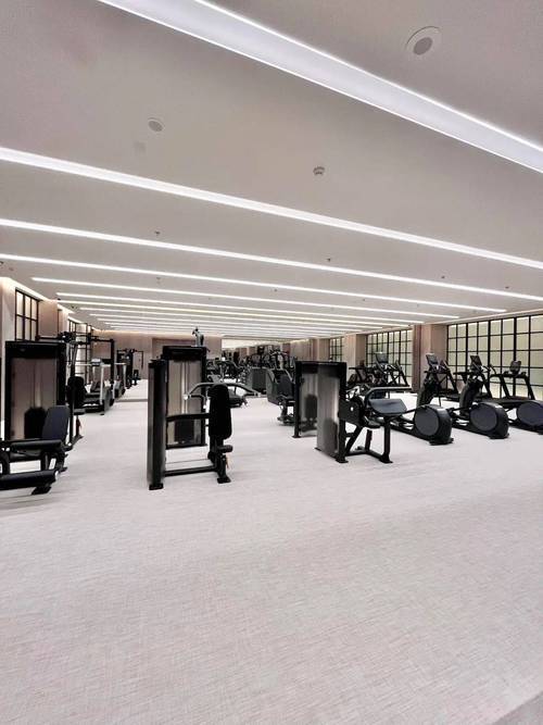 健身房的设计也同样充满了细节。黑框玻璃门的复古韵味,和现代健身空间的功能性做到了完美结合。