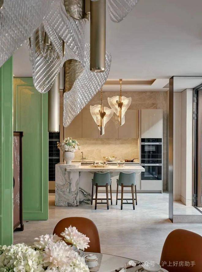 餐厅的设计巧妙融合了老上海的经典元素,圆形餐桌和橘色皮质餐椅在色彩上既现代又充满活力,顶部的水晶吊灯造型灵感来自上海市花“玉兰花”,既增添了空间的华丽感,又巧妙地融入了上海的地域特色。