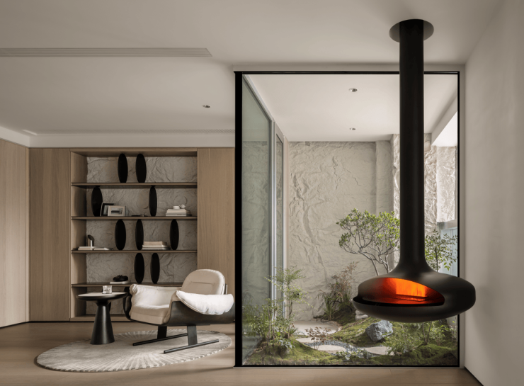 整个泳池天花板,呈现出海派拱形元素,落地玻璃窗外,是下沉式的景观空间: