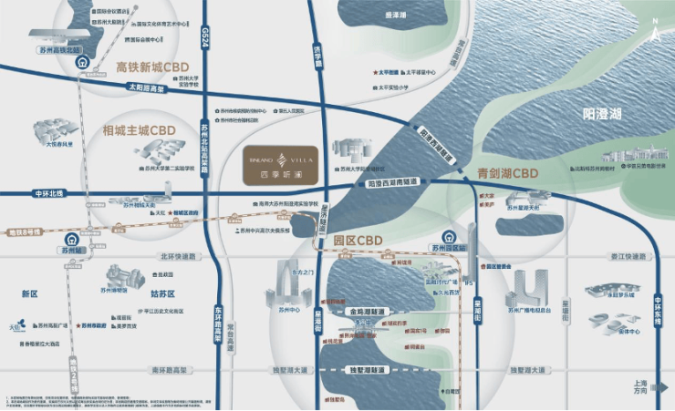 四季听澜占的位置,堪称“作弊”。它不在偏远的远郊画饼,而是在金鸡湖北、阳澄西岸这个成熟板块,坐享园区湖西、青剑湖、相城主城、高铁新城四大核心区的辐射红利。