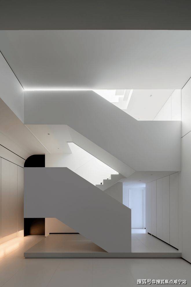 楼梯选用了纯白色,光是唯一的装饰品,在寻常中展现着空间最为纯粹的美。