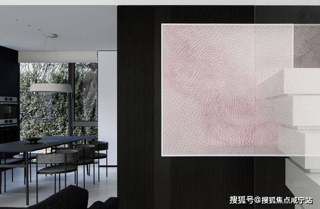 浅粉色的画好似是初开的粉色花朵,有着极为浪漫的基调,厨房就在其后,黑色系的厨房淡化了油烟,呼应着生活的烟火气息,沉稳之中带着圆满的幸福。