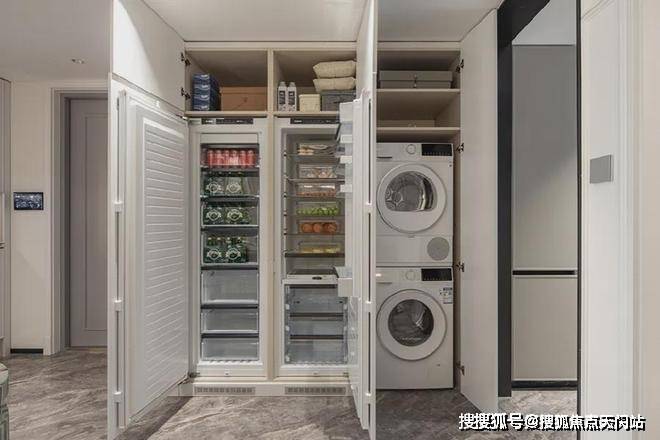 上海静安信达信安里售楼处电话☎:400-8123-664(预约看房热线)为了空间更好的布局,冰箱和洗衣机都放置在进门侧边的柜子区域。