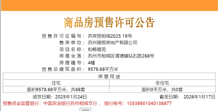 最新,位于相城的和畅雅苑首次取证,共68套房源。