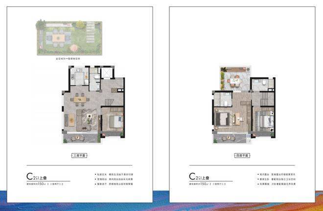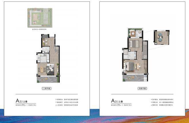 项目户型方面,面积段有两种——建面约95㎡下叠、上叠;建面约150㎡下叠、上叠。