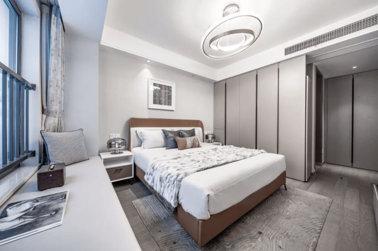 2021年,融创重回金沙湖,以杭臻源筑,重序主城标杆作品。项目延续融创标签感极强的「高级灰」美学立面,真石漆融合银灰色铝板线条,加上大面积Low-E玻璃门窗等材质,定制相融于国际金沙的现代风格建筑,对位高净值人群的审美品位。
