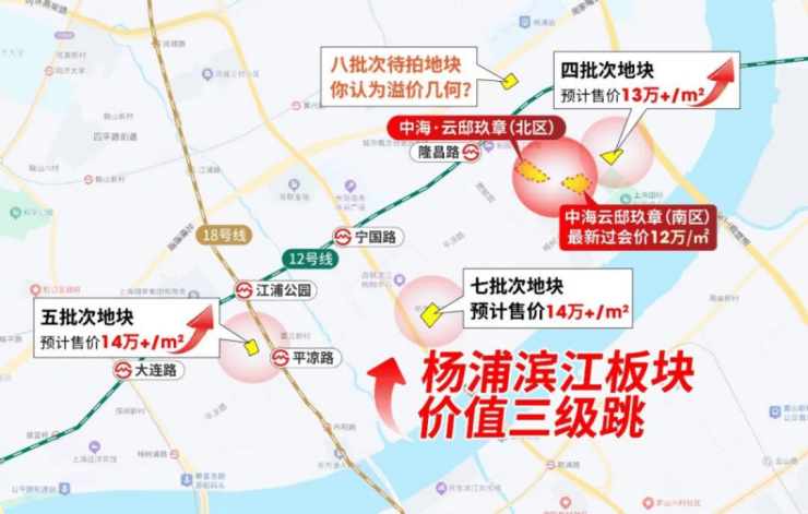 今年的杨浦滨江摁下房价加速器,土拍经历从6.9万/㎡—9.2万/㎡,涨约30%!新房未来预计也将迈上13-14万/㎡!