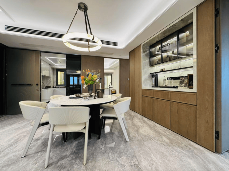 比如红酒雪茄厅,设计灵感来源于迪拜奢华酒店The Lana,颇有一种老上海风情;多功能区是一个270度水景环绕的区域,玻璃门可开可合,关上就是私密空间,打开就能亲近自然。