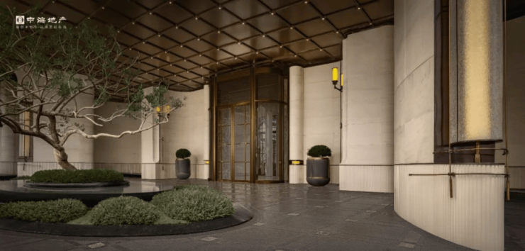 项目的主入口,门头承袭玖字理念,约55m横向尺度与约7m纵向高度,高于传统的约4m高景墙,搭配通高陈列的全石材柱体,恭迎业主归家。