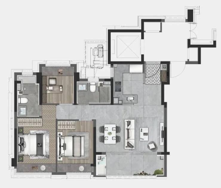 百平三房的创新传统市面上的百平户型,通常只能做极窄的厅堂,或是直接省去第三个房间。