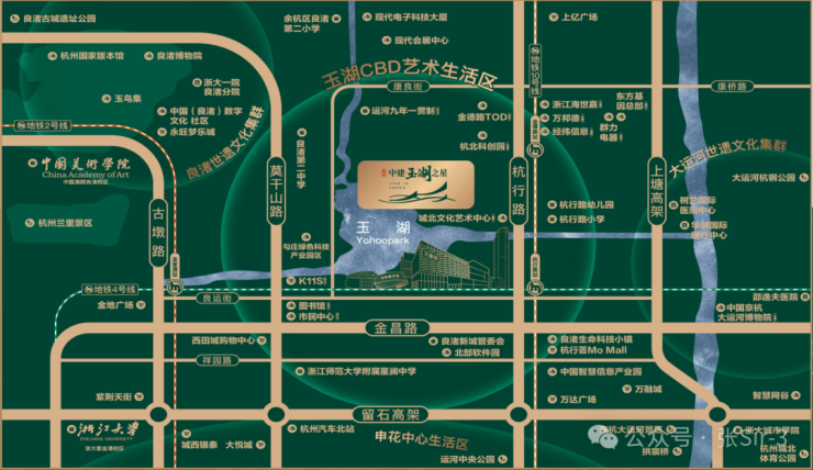 ——— 【项目基础概况】———【区域板块】:玉湖CBD艺术生活核区核心【项目地址】:余杭区·玉湖公园旁(杭行路与郁宅路交汇西约300M)【占地面积】:44914㎡【建筑面积】:112285㎡【户型面积】:建筑面积约115-185㎡【楼幢规划】:10幢【产权性质】:70年住宅