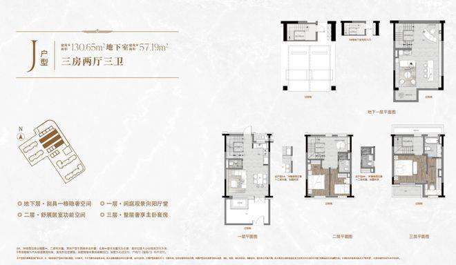 一楼和地下室主社交和志趣,二楼是子女的房间,三楼是主人休憩区。