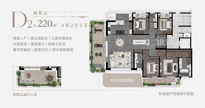 ● 空中庭院:户户空中庭院,栋栋架空层;露台超6米挑高,赠送面积约15㎡ - 35㎡,部分户型拥有约270°弧形转角露台,环幕视野,尽揽太湖浩瀚风光,让生活与自然无界交融。