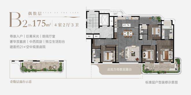 ● 稀缺组合:湖居+四代宅的双重稀缺组合,规划建面约150㎡ - 240㎡低密奢阔大平层,是板块内首个湖居四代宅产品,实际使用得房率约100%。