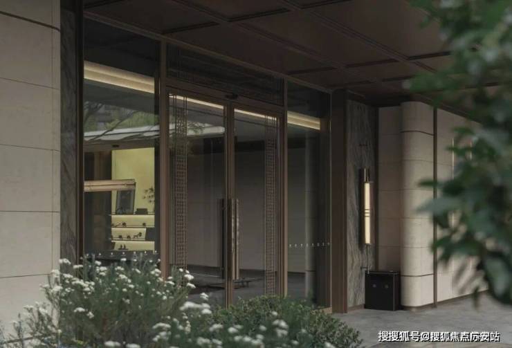 社区入口设计以“隐奢”为核心理念,摒弃传统豪宅项目的张扬符号,转而通过材质、比例与空间叙事的精准把控,传递低调中的精致感。主入口并未采用高耸的门楼或繁复的装饰,而是以米黄色石材与香槟金色金属格栅的组合,构建出克制而优雅的视觉语言。