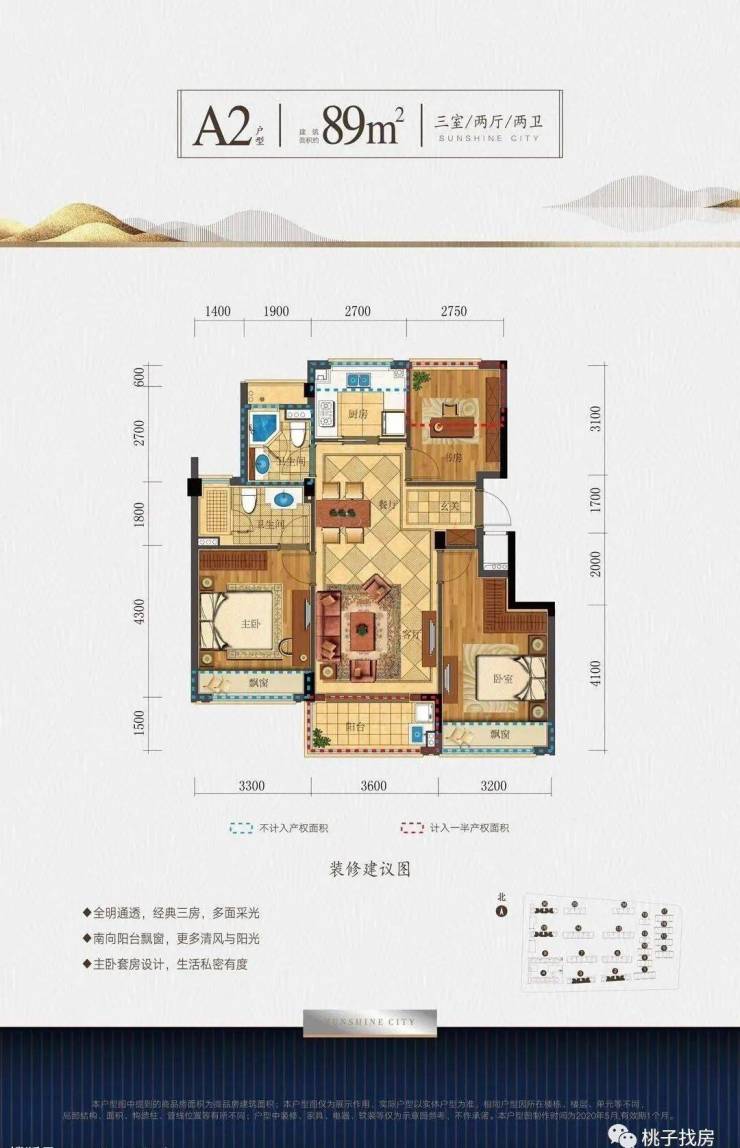 实地走下来,亲身感受项目周边并没有“荒凉”的感觉,各项配套也有,只不过是镇级配套而已。仔细看有飞机经过交通方面:与地铁7号线义南路站(规划)相距约300米。①两个89方户型都属于类四叶草户型,三开间朝南,阳台与客厅相连,主次卧带飘窗。另外,主卧带独立卫生间;①同样三开间朝南,次卧和客厅阳台相连,主卧带飘窗以及独立卫生间。