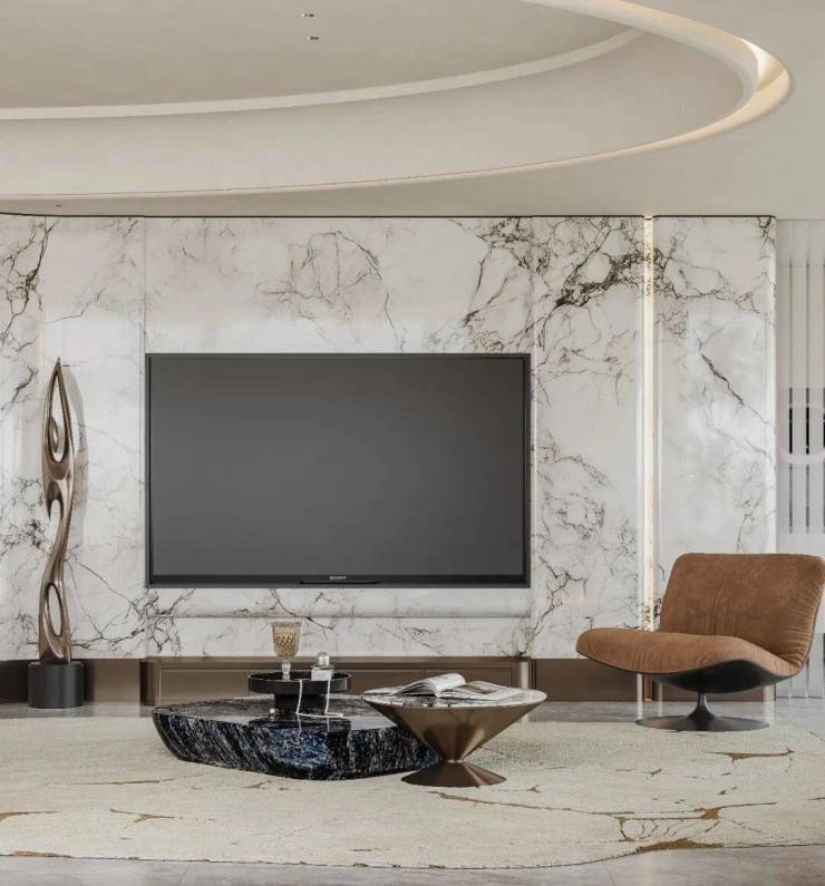 选材上,整面大花白奢石通铺背景,以天然石纹奠定空间高级感,底部配金属收口。灯光用多层间接光源,即吊顶弧形灯带与墙面隐形洗墙光,以柔和光影凸显石材肌理,营造温润静谧氛围。