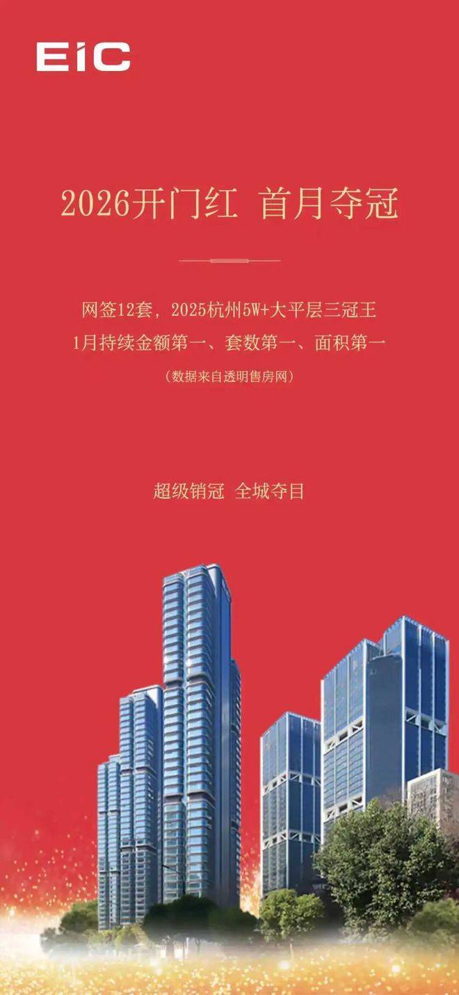 2026年伊始,EIC超级创新城再次以卓越的产品力交出了炸裂市场的成绩单。据透明售房网数据显示,继2025年度荣膺“三冠王”后,EIC在2026年1月持续领跑杭州5000万级大平层市场。