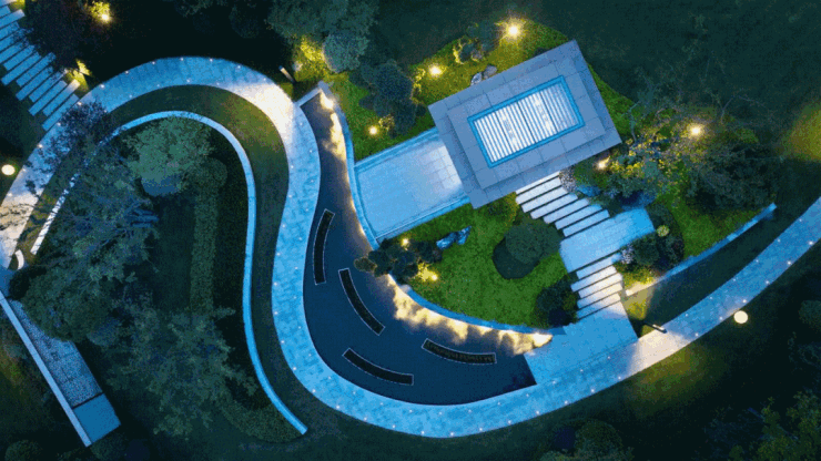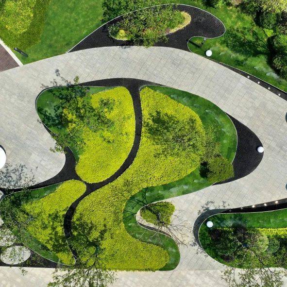 园区景致,从曲径通幽处起始,穿过月洞门,将外界的喧嚣经由林荫小径,变换为静谧的归家心境。复行数十步,会听到水声流鸣,仿若弯月的一池水景映入眼帘,潋滟的波光倒映着一畔的景亭,传统文人笔下的雅集之趣与山水气韵悠然而至。