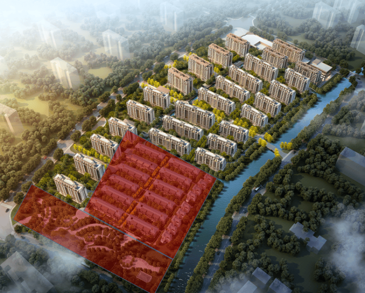 (北辰观澜府69号地块鸟瞰图,红色区域为别墅新品及内部园林)