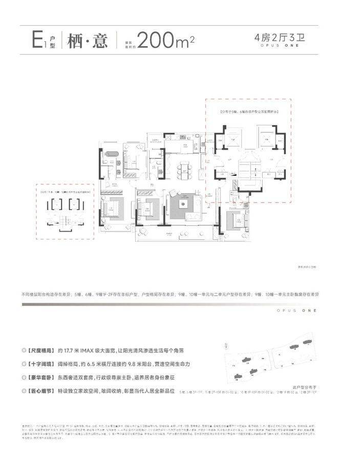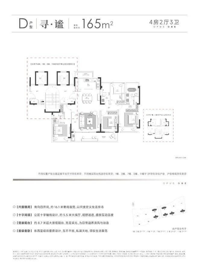 建筑面积约165-248㎡人文大平层,最大超20米面宽、阔境轴线、双套房设计(差异户型除外),同时甄选精装品牌,开启同频国际的智能化家居生活。