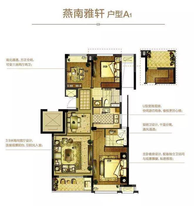 这是该项目的主力户型,可改3房。南北通透,户型全明,U型厨房,主卧套房设计带独卫。