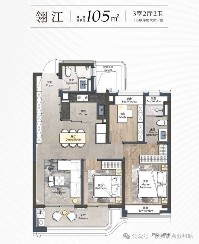 l超拓设计:三开间朝南+横厅,主卧套房配置独立衣帽间及270°转角飘窗,空间利用率大大提升。