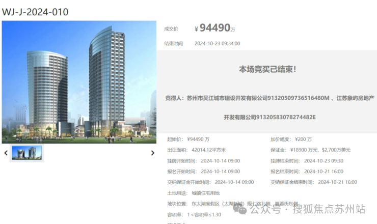 在2024年10月,该地块被吴江城建和象屿联合竞得。地块成交总价高达94490万元,成交楼面价为17300元/平方米,溢价率为0%。