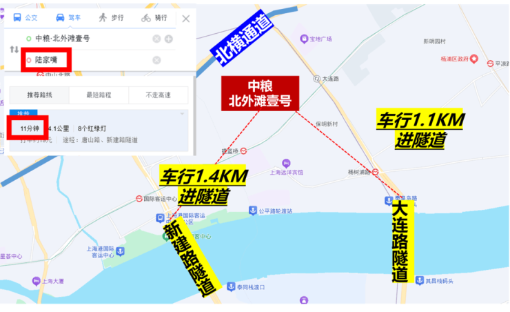 自驾上,项目往北约300米就是北横通道,往南车行约1公里,就是新建路隧道和大连路隧道直达浦东。从项目到陆家嘴、北外滩和外滩都在10分钟左右。