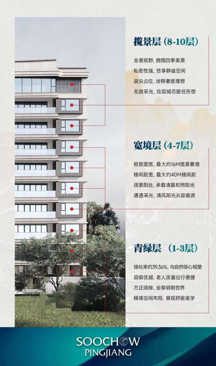 立序姑苏,筑“熙和系”序章。熙和平江择地千年文化之脉、苏城政经中芯—姑苏区平江新城,规划13幢建面约105-190㎡舒适洋房住区。融合苏式美学风格,构筑1轴9境3座人文会客厅,打造三进归家景观礼序......绘制城芯人物居住所想场景。