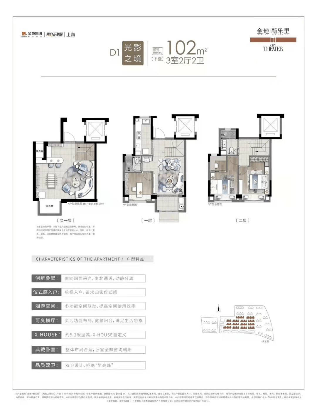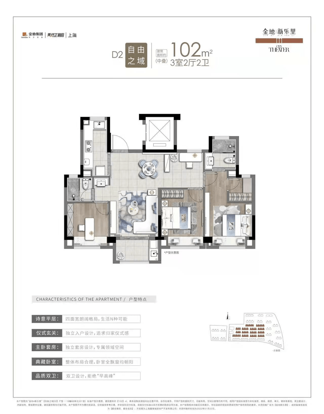 项目入门级的叠加户型,建筑约为102㎡,最明显的特点就是四开间朝南。