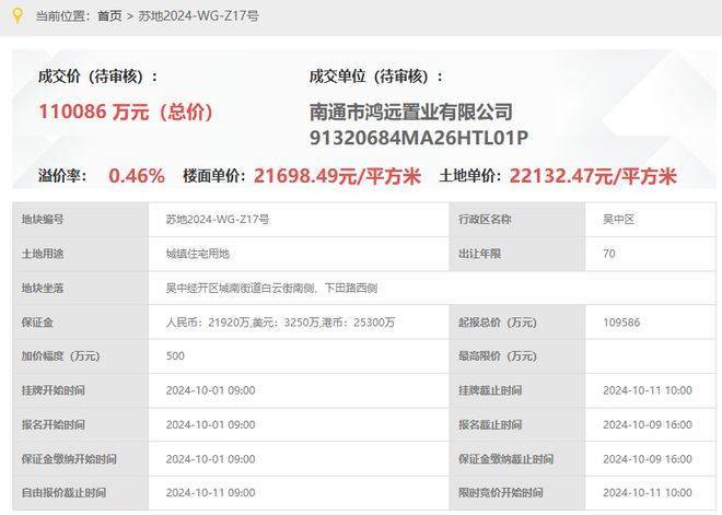 鸿湖上,即,苏地2024-WG-Z17号地块项目,位于吴中经开区城南街道白云街南侧、下田路西侧,是2024年10月11日,南通市鸿远置业有限公司以总价110086万元竞得,成交楼面价21698元/平,溢价率0.46%。