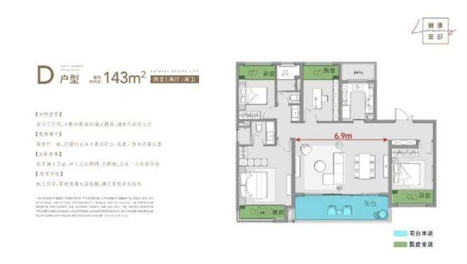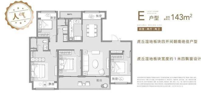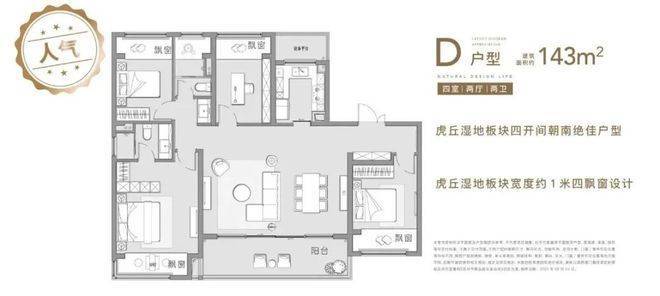136㎡和143㎡户型均是四房四开间朝南,大横厅或者双联阳台可选,属于市场上主流的改善产品。值得一提的是,项目赠送的约一米进深大飘窗据说是板块内最宽飘窗。