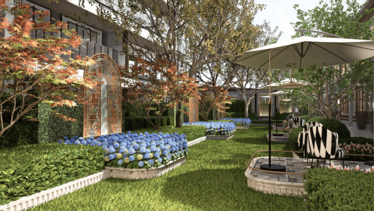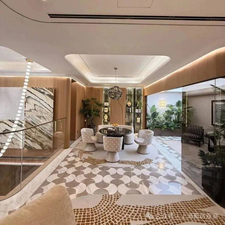 社区内设有上海风情的“三院”、海派精奢的三花园,让优雅的生活氛围随之铺展开来。下沉庭院整体长约18米,进深约9.5米,庭院的上下景观通过水帘相连通,中间结合有着层层叠水的水景,搭配水晶砖的景墙,将品质感拉满。