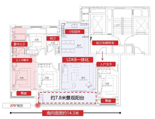 比如大横厅,改造性超强,U型小西厨+餐客厅+连通阳台,270°环幕视野,开间长约7.8米双联阔景阳台,尺度无敌!