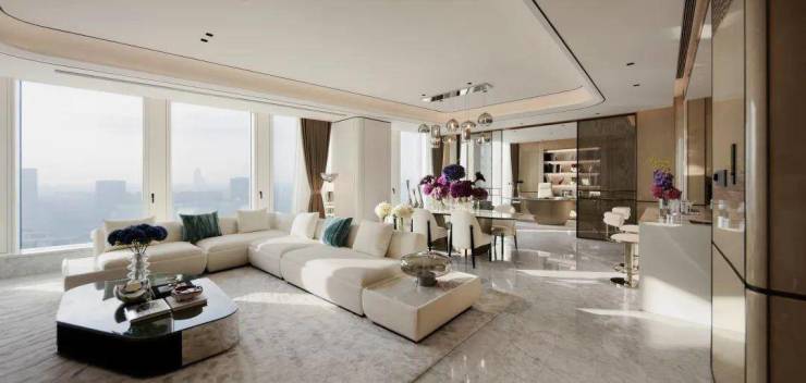 The lobby is paved with Turkish white sand and Italian Carrara white. The walls and floors of the public areas on each floor are covered with the same style of Oman rose stone as that of Shenzhen Bay One, and there is also cloisonne...